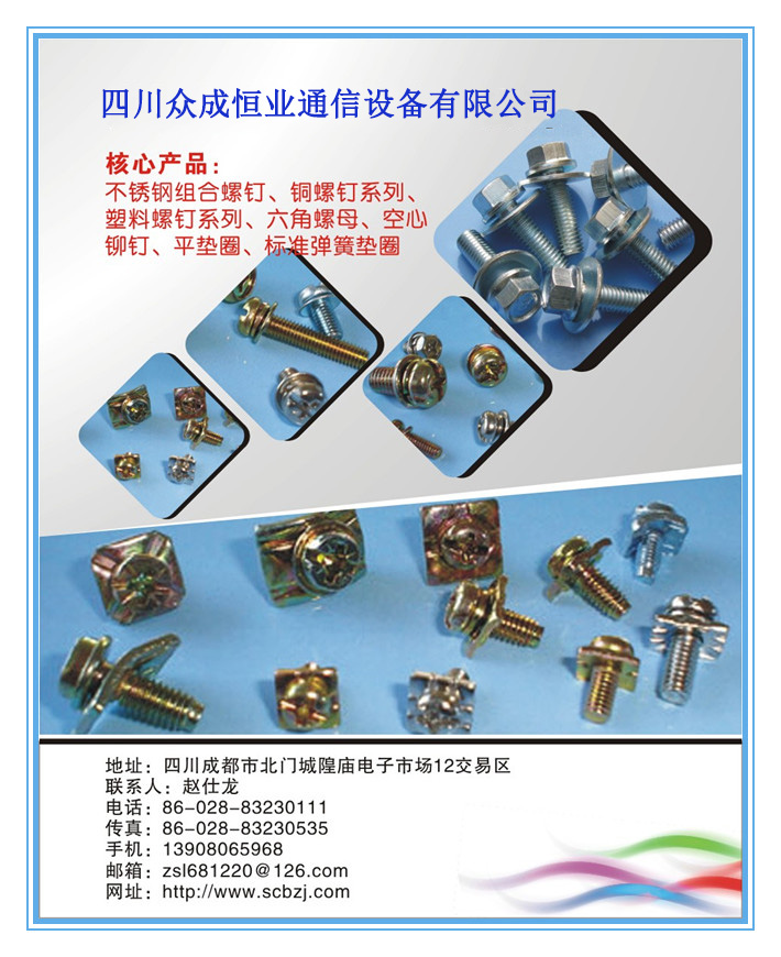 主要經(jīng)營項目:標準件。電子產(chǎn)品、五金交電、主要經(jīng)營:不銹鋼標件、銅鍍銀調(diào)試螺釘、碳素鋼標件、各種非標件、銅柱訂做,電子元器件,專業(yè)代理安費諾QMA,SMA,BNC等系列接頭,通信射頻線,連接器,尼龍扎帶等
